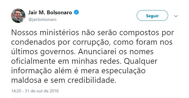 Três dias após ser eleito, Jair Bolsonaro disse, por meio do Twitter, que seu ministério não seria composto por condenados por corrupção. Ocorre, no entanto, que a lista de enrolados com a Justiça só aumenta. Além de Salles e Lorenzoni, outros setes futuros ministros do presidente eleito são investigados ou réus em ações judiciais: Tereza Cristina (Agricultura), General Heleno (Segurança Institucional), Damares Alves (Mulher, Família e Direitos Humanos), Luiz Henrique Mandetta (Saúde), Marcos Pontes (Ciência e Tecnologia), Marcelo Álvaro Antonio (Turismo), Paulo Geudes (Economia).